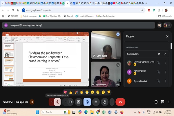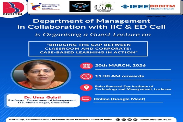 Dr Uma Gulati, Professor at the Department of Management (MBA), I.T.S Mohan Nagar, had the privilege of being invited as a Resource Person for a guest lecture at BBDITM, Lucknow, on “Bridging the Gap between Classroom and Corporate: Case-based Learning in Action” on 20th March, 2026.